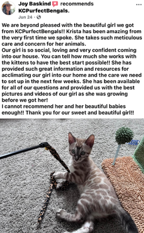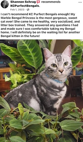 Welcome to our home of loving Bengal cats, located in Kansas City, Missouri. We pride ourselves on raising socialized and affectionate Bengals, ensuring that each kitten is well-adjusted and ready to bring joy to their new families. As a TICA-registered breeder, we are committed to the highest standards of care and ethics. All our parent cats undergo comprehensive genetic testing through Wisdom Panel, and we are proud to confirm they are clear of any genetic concerns. Please note that we do not sell breeding rights, as our focus is on providing exceptional companion pets. The photos displayed are of our beautiful previous litters, showcasing the quality and love that goes into each of our Bengals.